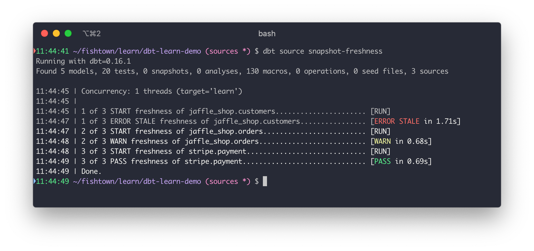 To obtain freshness information for your sources, use the dbt source freshness command (reference docs):