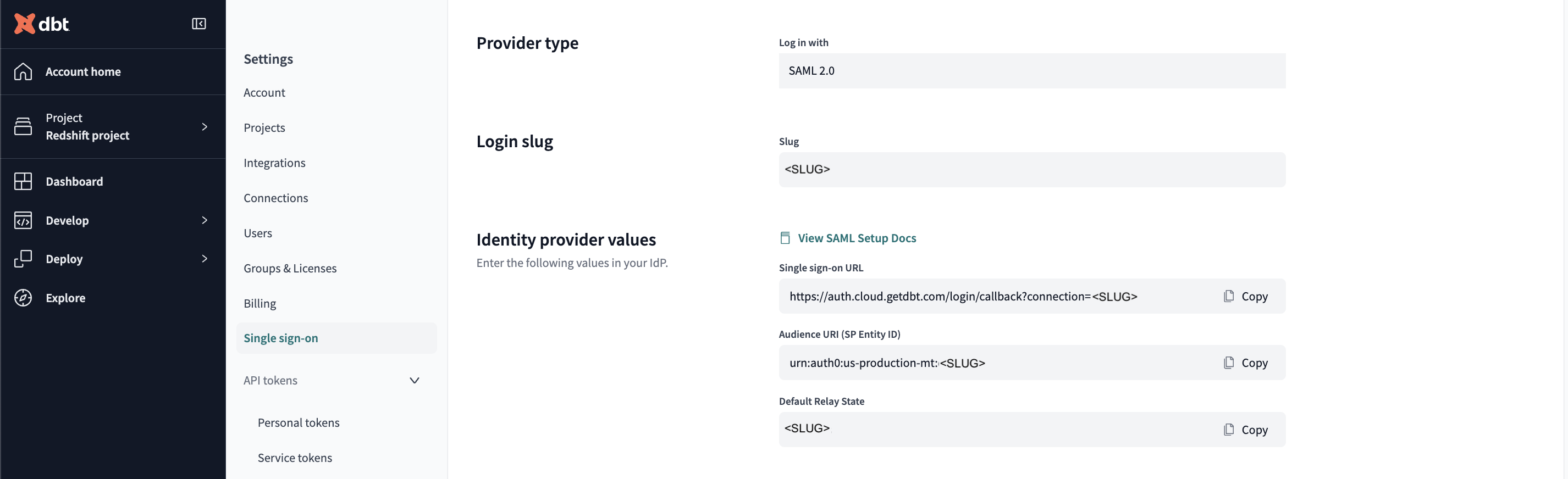 <SLUG>with your organization’s login slug. It must be unique across all dbt Cloud instances and is usually something like your company name separated by dashes (for example,dbt-labs).